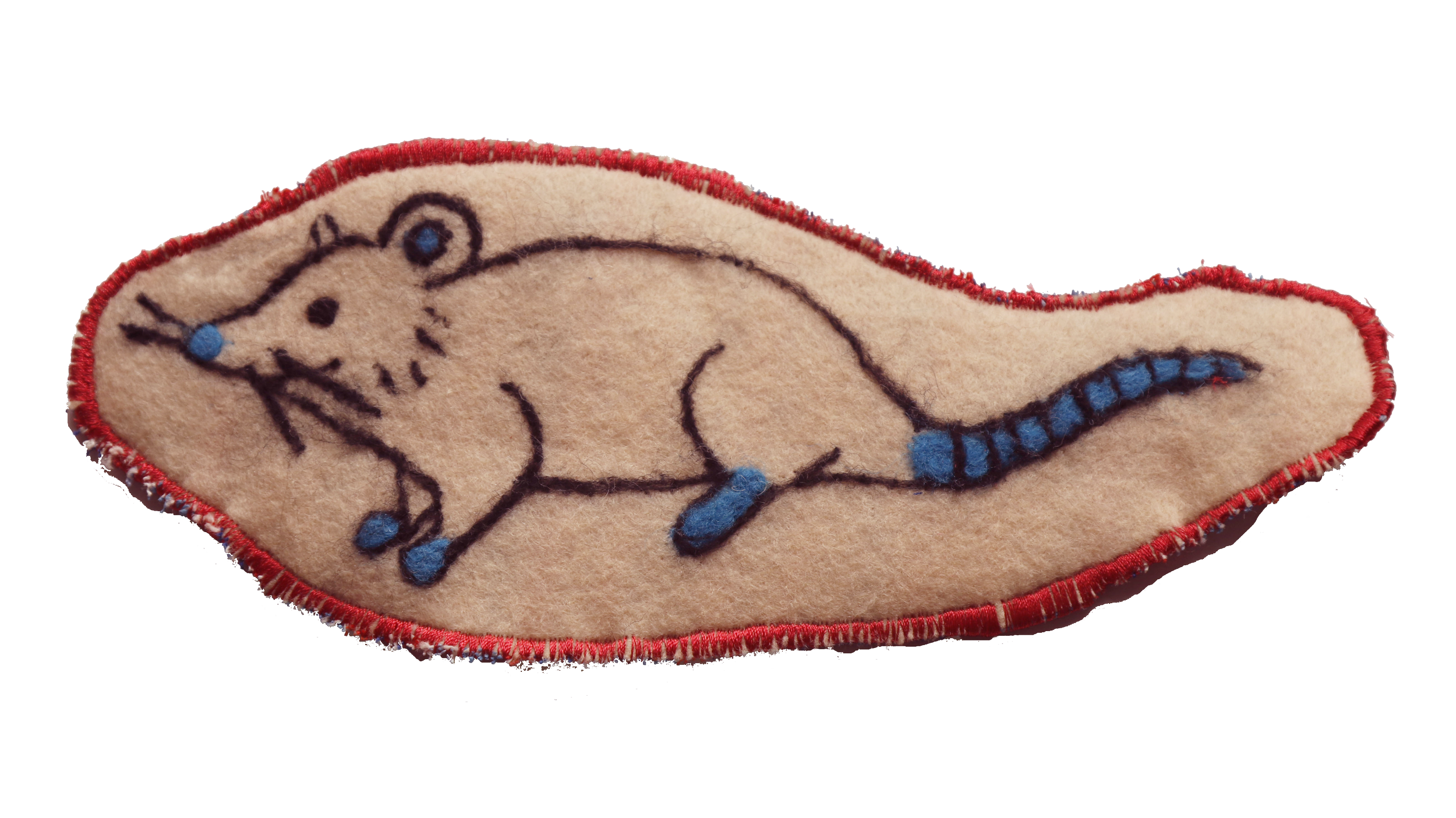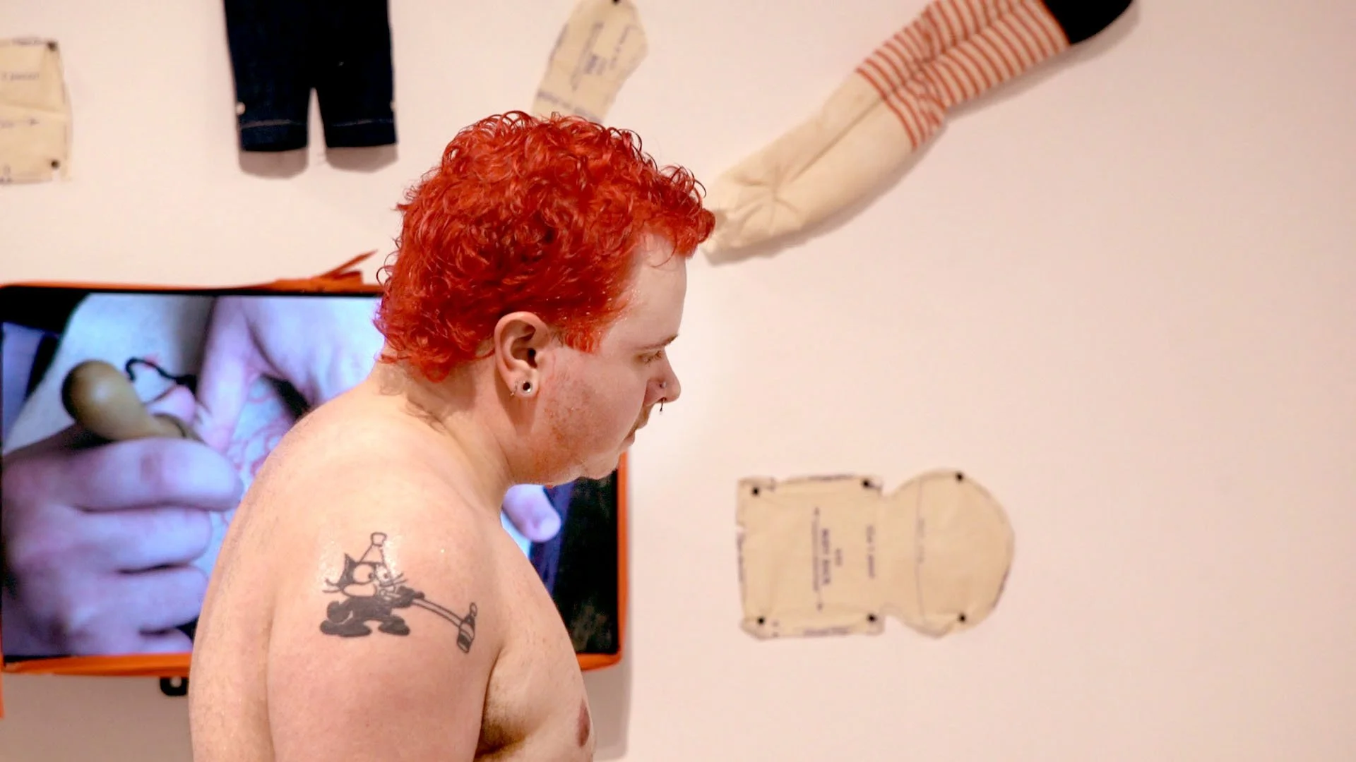 “Making a Raggedy Tranndy of Myself” explores the construction of nontraditional gender presentation through body modification, in this case through tattoos. Raggedy Ann and Andy are examined as cultural symbols representative of societally enforced gender norms. However, the dolls are gendered not by their bodies, which are almost identical, but by the external elements applied to the body (gendered signifiers in hair and clothing.) Coerr recreates this relationship between the ungendered doll body and externally applied signifiers, but he queers the narrative by drastically increasing the scale of the doll, and applying needle felted recreations of his own tattoos as velcro patches. The act of applying these patches examines the great immediate agency over one’s body that tattoos provide to their wearers, specifically among queer and trans people. The removable and re-placeable nature of the patches alludes to the permanence of tattoos, and grounds the object’s interactivity in the realm of play.